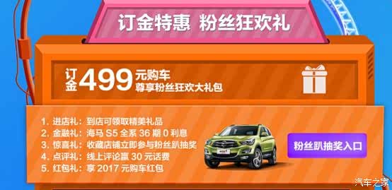 活动期间,登入海马汽车天 .官方旗舰店,在线支付499元订金购买海马S5,凭专享码到店购车即可享受五重狂欢礼:金融礼、进店礼、惊喜礼、点评礼、2017元购车红包礼等你抱回家!