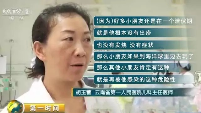 不少家长们喜欢带着孩子们去儿童游乐园,色彩缤纷的“海洋球”作为近些年来的“黑马”,广受孩子们的欢迎。许多人却不知道,这种“海洋球”隐藏着不少的安全隐患! 卫生状况堪忧 在谈及对孩子玩“海洋球”有什么担忧时, 不少家长口中提及最频繁的词, 就是“不干净”。 更有家长说 每次孩子都是白袜子进黑袜子出 也许‘海洋球’池真的不干净 甚至可以说很脏... 海洋球是传染病重灾区 孩子们喜欢将自己埋在小球里,甚至喜欢拿着小球又啃又舔。宝宝的手、口脚、皮肤直接接触球里的细菌、病毒,如遇到流行性疾病的高发期,如:呼吸道疾病、疱疹、手足口病、流行性感冒等,一个孩子感染到疾病,整个游乐园里的孩子得病的几率就会大大提升!很多人都知道,5-8月是手足口病的高发期,但其实,10-11月是次高发期。 云南省第一人民医院胡玉蕾医生表示: 因为好多小朋友还是在一个潜伏期,就是他根本没有出皮疹,也没有发烧没有症状,但是他可能已经带有这个病毒,小朋友如果到海洋球里边去玩了,其他小朋友肯定有这种再被他感染的危险性。 看到这里,妈妈们是不是都慌起来了。有些妈妈只听过“手足口”这个名字,又听到一些重症的传闻,感觉很吓人,孩子又特别喜欢去玩海洋球。这可怎么办呢?今天这篇科普文,希望能让妈妈们了解和科学预防这个儿童常见病。 症状:手足口病长啥样? 手足口病(HFMD)是由多种人肠道病毒引起的一种儿童常见传染病。以5岁以下儿童为主,3岁以下儿童发病率最高。潜伏期为2-10天,病程一般为7-10天。 患病的宝宝会出现发烧的症状,部分伴有咳嗽、流涕、食欲不振等,和普通感冒很像。然后,宝宝的口腔、手心、脚心和臀部会出现皮疹或疱疹。但好在大部分患病宝宝的症状都很轻微,一周左右就会自愈。 病因:病毒感染 手足口病是由肠道病毒感染引起的。肠道病毒是一类病毒的统称,有很多不同的品种,比如柯萨奇病毒、埃可病毒、肠道病毒71型等,在我国最常见的是CVA16和EV71(妈妈们不用理会这些奇怪又拗口的名字哈,反正都无药可医)。 治疗:对症治疗,等待自愈 前面也说了,大部分宝宝症状并不严重,不会危及到生命。“感冒是病毒感染,没有特效药,不用吃抗生素,不用吃中成药,只要对症治疗、等待自愈即可”这一观点已经被很多家长所接受了,现在,你要接受的就是这个观点的升级版——虽然手足口病看起来比感冒要严重很多,这依然是无特效药的疾病,也不用吃抗生素、中成药、所谓的抗病**;若是体温太高,你可以给孩子吃退热药物;大约需要7-10天的时间,孩子就会自愈。 嘴里的疱疹会让宝宝很疼,拒绝进食。妈妈可以让宝宝用温开水或盐开水漱口,吃一些温凉的流质或较软不需咀嚼的食物来让宝宝舒服一点。也可以给他喝冰牛奶或吃冰淇淋来缓解不适。 传播:病从口入 手足口病可经胃肠道(粪-口途径)传播,呼吸道(飞沫、咳嗽、打喷嚏等)传播,另外,接触患者的口鼻分泌物、皮肤或粘膜疱疹液及被污染的手及物品等也会造成传播。简单总结成一句话就是,病从口入。 防病:洗手是最好的预防 既然是病从口入,那就好办啦。所有宝宝可能会放进嘴里的东西都要清洗干净。不仅要给宝宝勤洗手,妈妈在给宝宝换过尿布后也要勤洗手哦。 肠道病毒最怕紫外线和高温煮沸式消毒,可以用这两种方式来消毒。 另外家里要多通风,尽量避免带宝宝去人群密集的公共场所。有些感染者并没有发病症状,但在发病前几天,就已经携带了传染病毒。疾病高发期间,不要往人多的地方凑。 看完今天的文章,妈妈们对手足口病都有了更多的了解吧。手足口病并不可怕,大部分都可以自愈(就跟感冒一样),家长们无须恐慌(重症并没有办法预防,即便恐慌也没用)。发病之后,该怎么处理就怎么处理,警惕重症病例的几种症状。 最后再强调一遍,手足口病的预防非常,非常重要!而且非常,非常简单:勤洗手!勤洗手!勤洗手!