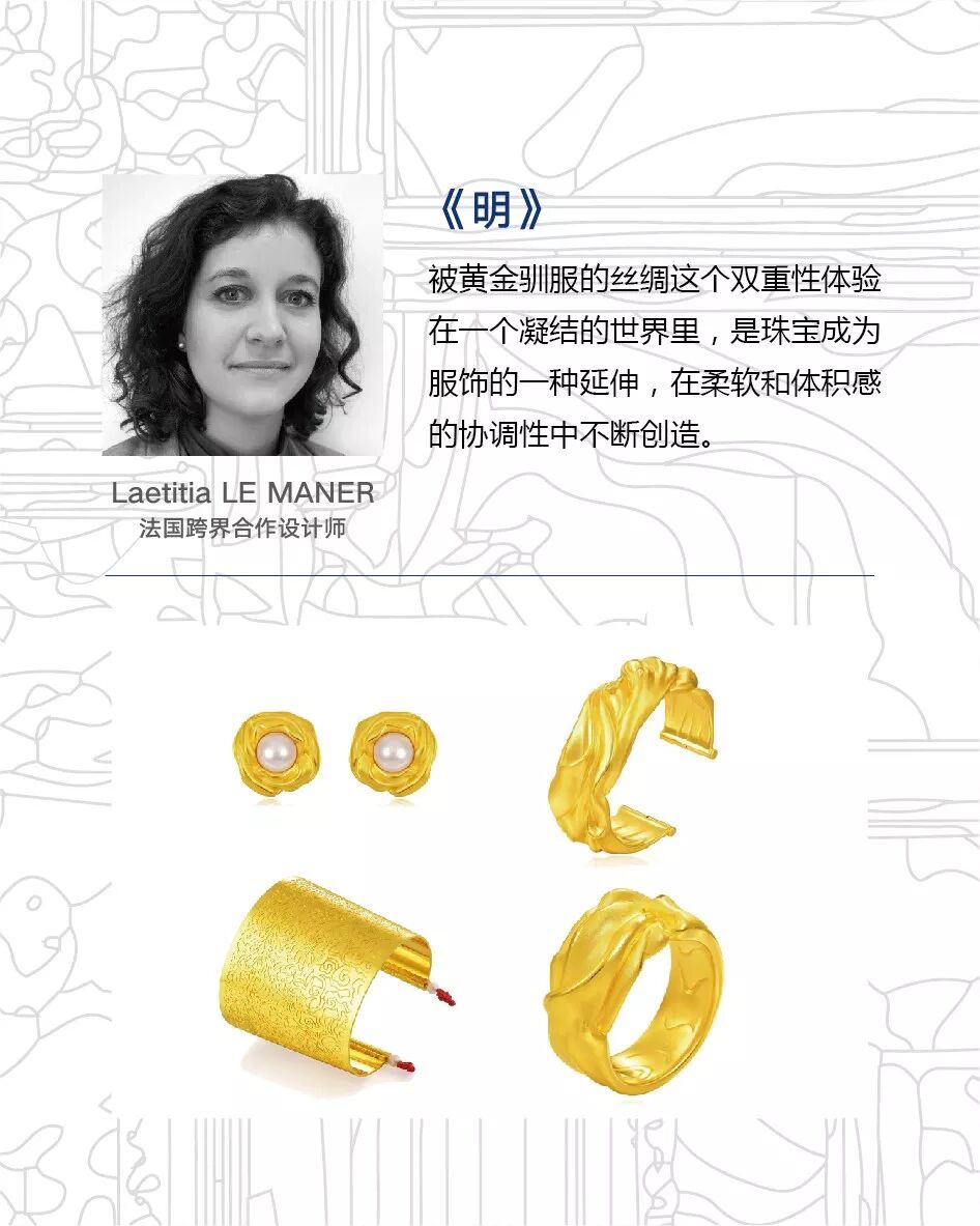 本次为周大福设计的首饰来自于刚柔结合的灵感。《明》呈现一种皇室贵族的风范。同时,绸带套系表现女性身上附有的独特优势。柔软的丝绸和刚硬的黄金,刚和柔相互碰撞,在柔软和体积感的协调性中不断创造。让接触到它的每一个人能了解其中的文化和生活愿景。