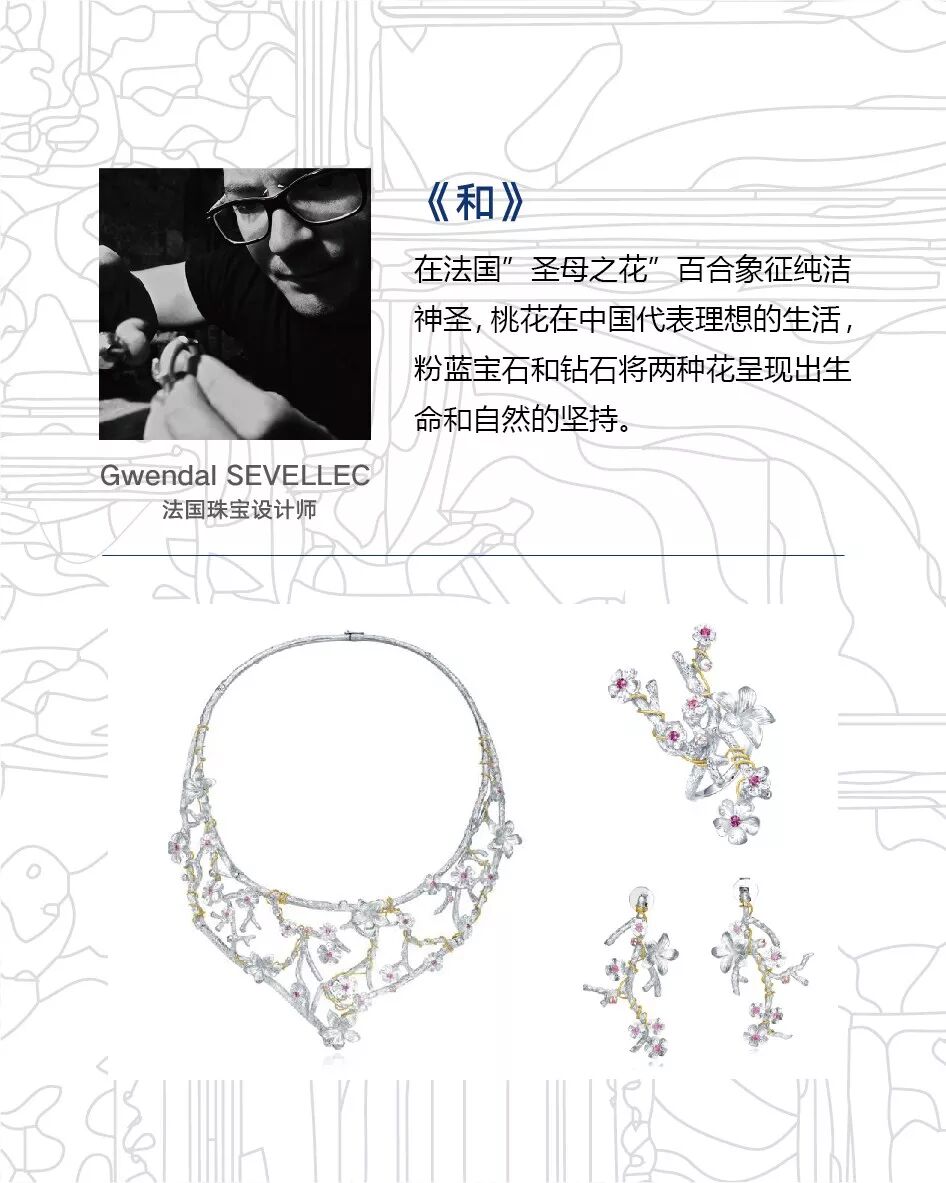 古往今来,花卉更是中法两国文化中重要的部分,《和》的设计灵感来源于百合花和桃枝,Gwendal将百合花和桃花花开最美、最自然形态配以粉蓝宝石和钻石呈现出来,代表着生命最灿烂的时刻。