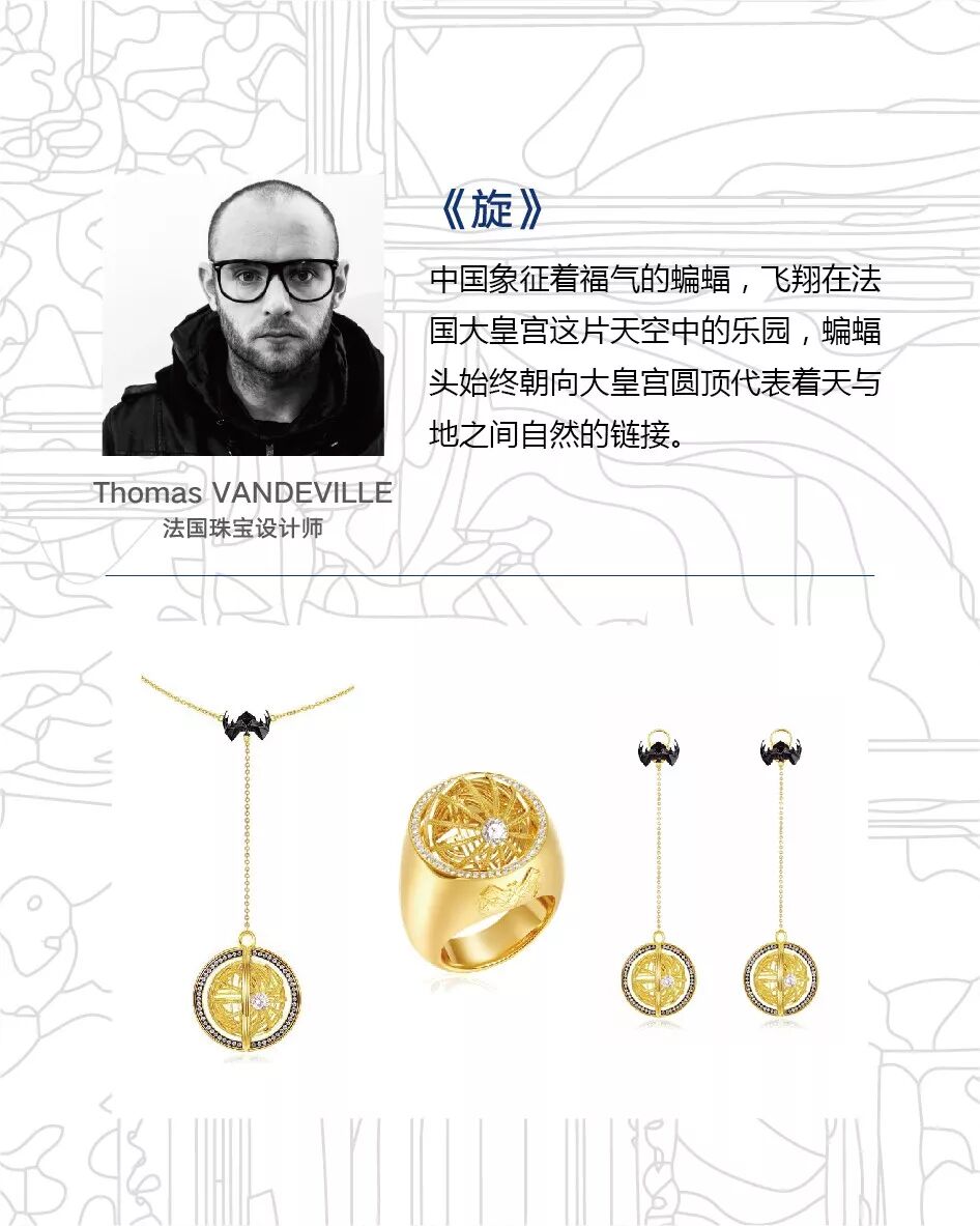 Thomas V喜欢研究古罗马的斗兽者和相关的动物形象,本次为周大福设计的这套《旋》系列,灵感则来自于在中国象征着福气的蝙蝠,他认为这是中国文化与个人认知最完美的结合。设计中的法国元素来源于法国大皇宫的圆顶,蝙蝠在飞翔的时候,大皇宫代表着天空的乐园,而蝙蝠头始终朝向大皇宫圆顶则是天与地形成了自然的链接。珠宝中所镶嵌的宝石数量和钻石份数均为9的倍数,数字9能带来好运,音同“久”意味长长久久。