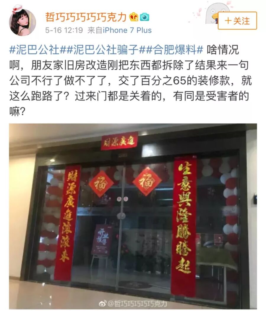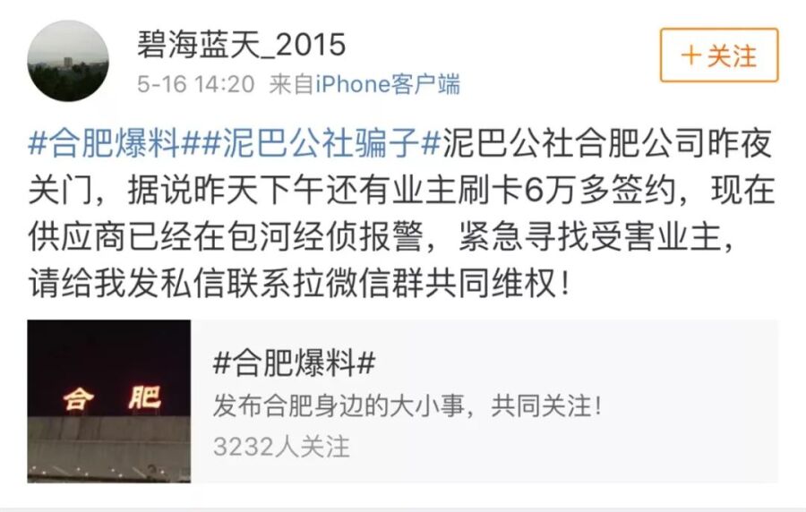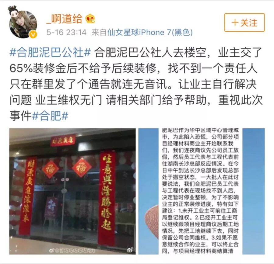 5月16日,有部分业主就在微博上爆料,泥巴公社合肥分公司在前夜就关门了。