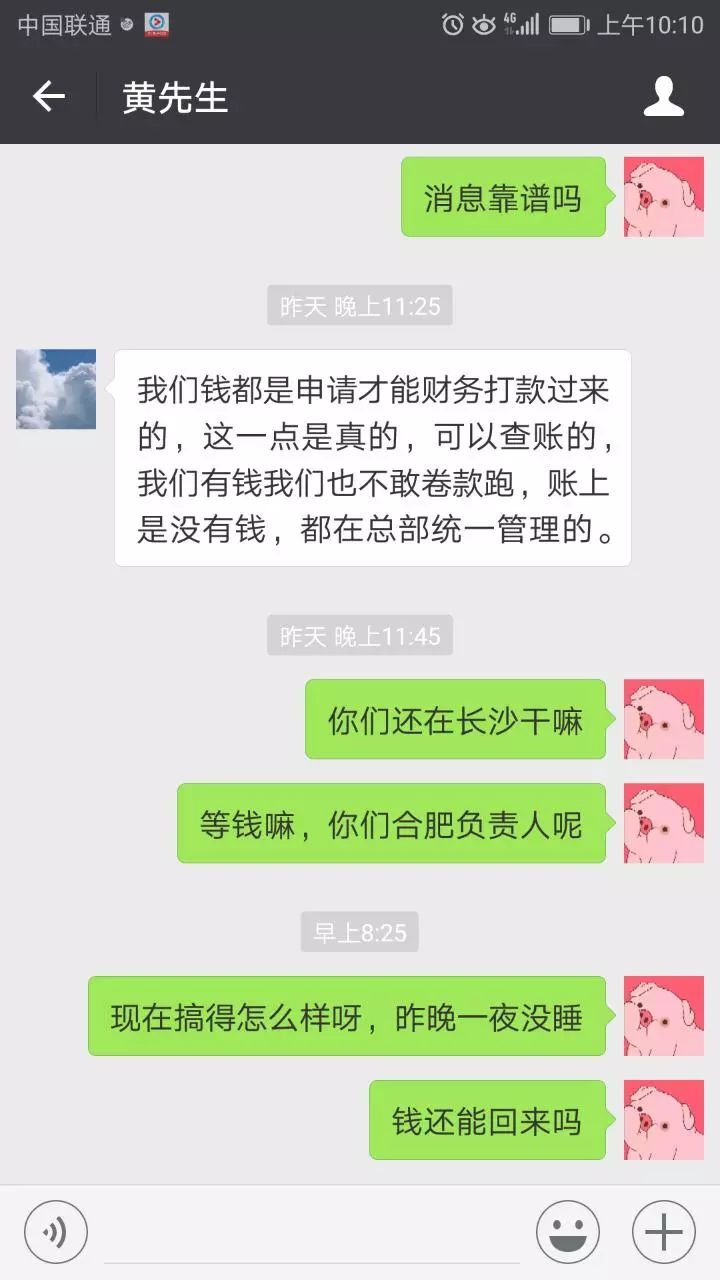 5月16日,合肥分公司员工和工程代表赶往湖南长沙总部时,发现公司被搬空,一大批人讨要说法。因钱款都是总部账户统一管,16日夜里9点,合肥分公司连夜开会,决定停业整顿。