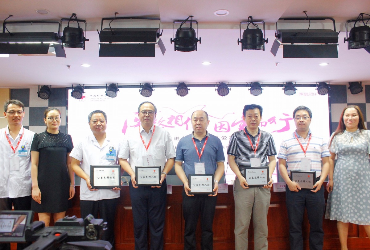 阜阳市卫健委秘书长韩笑笑,阜阳市颍州区卫健委副主任丁晓红共同为专家颁发公益先锋人物奖牌。