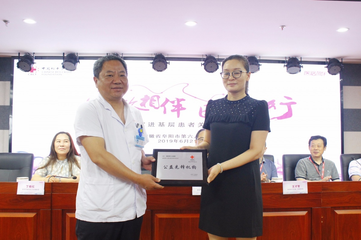 最后是授牌环节。由阜阳市卫健委秘书长韩笑笑代表中国红十字基金会为阜阳市第六人民医院授予“公益先锋机构”奖牌。