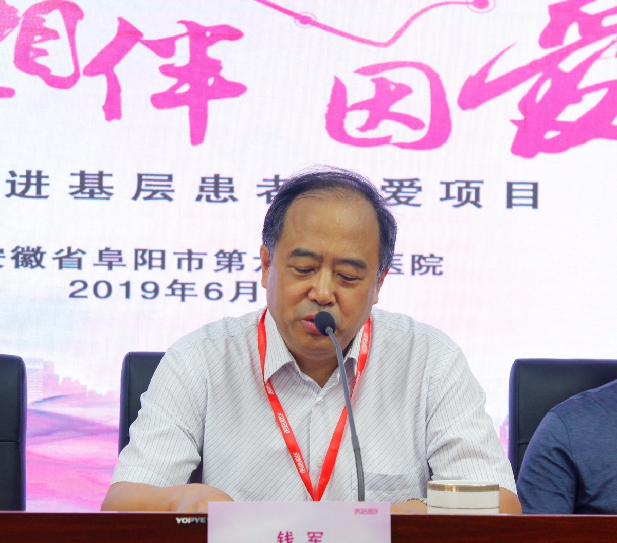 蚌埠医学院第一附属医院肿瘤外科主任钱军教授致辞。在讲话中钱军教授表示非常感谢受邀来到阜阳市妇女儿童医院开展本次公益义诊活动,自己将不遗余力为阜阳的患者排忧解难,并预祝本次活动取得圆满成功。