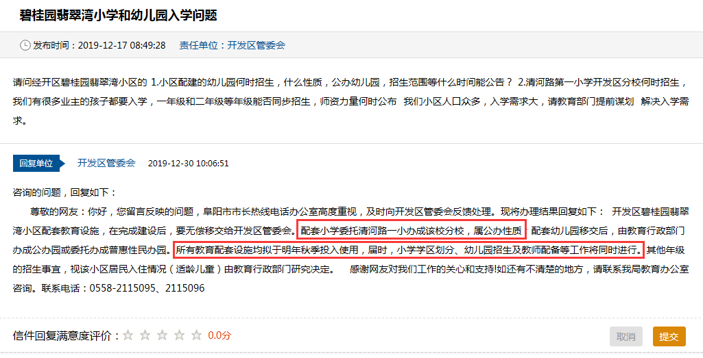 网友咨询:请问经开区***翡翠湾小区 1.小区配建的幼儿园何时招生,什么性质,公办幼儿园,招生范围等什么时间能公告? 2.清河路第一小学开发区分校何时招生,我们有很多业主的孩子都要入学,一年级和二年级等年级能否同步招生,师资力量何时公布,我们小区人口众多,入学需求大,请教育部门提前谋划解决入学需求。