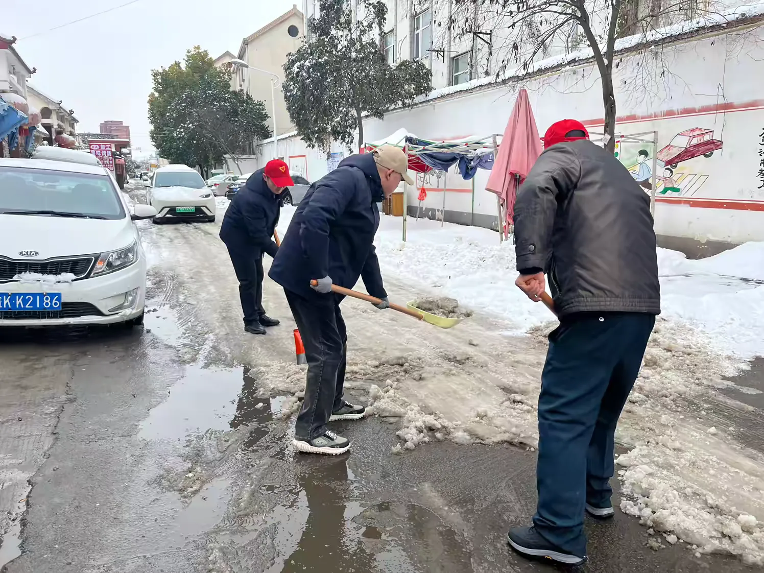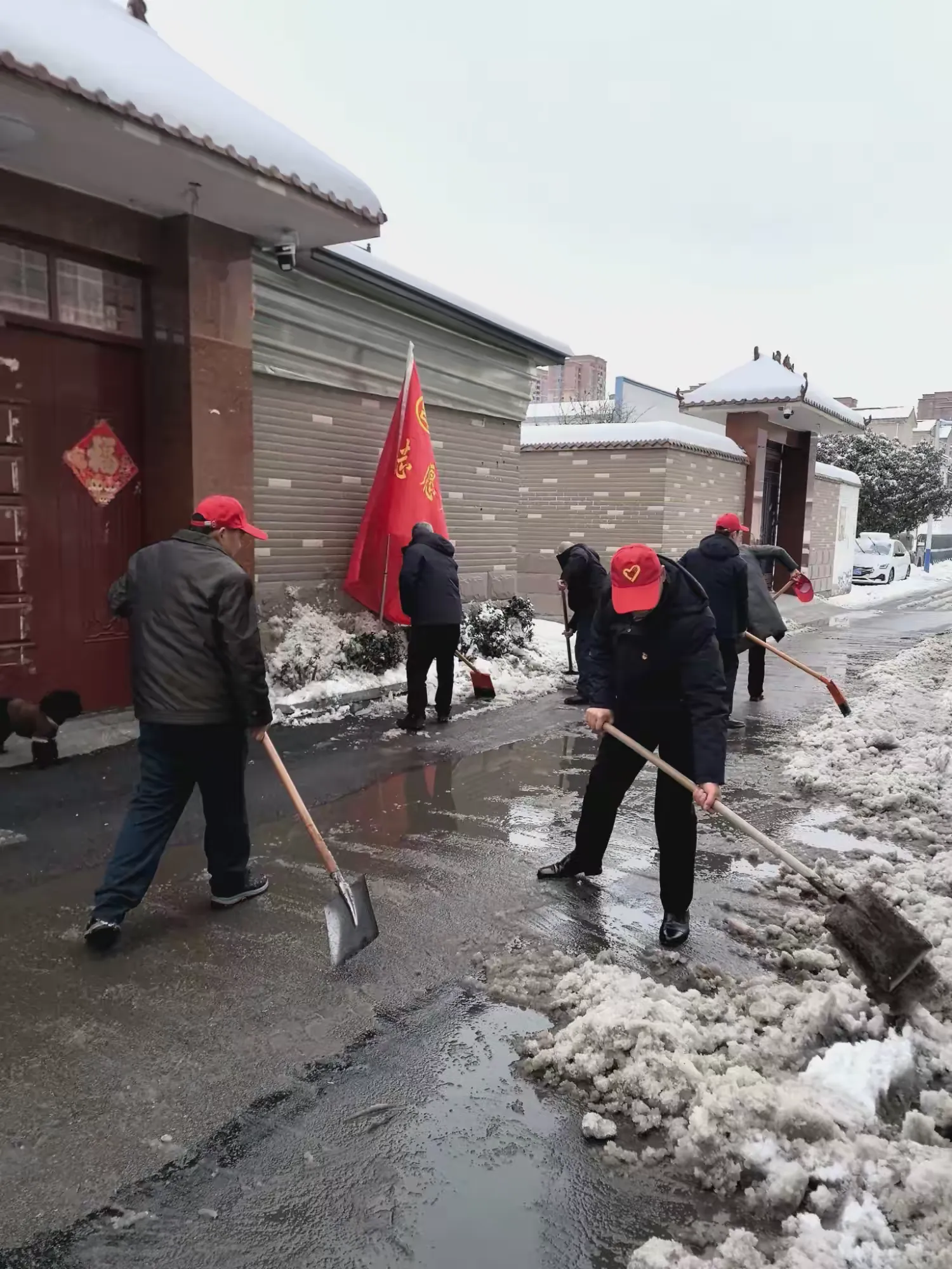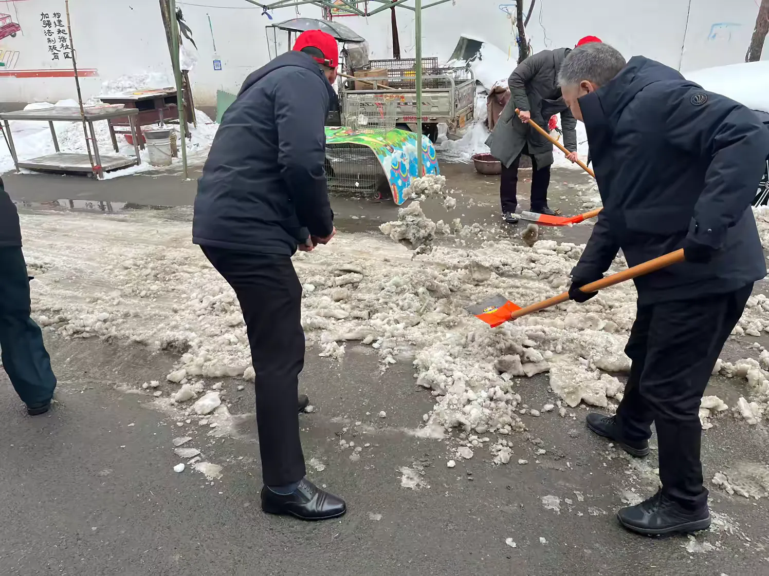 志愿者们头戴红色志愿者小红帽,手持工具,精神抖擞地来到了指定的责任路段。尽管寒风凛冽,但大家没有丝毫退缩。一到现场,志愿者们便迅速投入到工作中,分工明确,配合默契。有的用铁锹用力地铲除路面上的坚冰,一下又一下,冰层在铁锹的撞击下逐渐破碎;有的用扫帚将铲起的积雪和碎冰清扫到路边,堆成一个个整齐的小雪堆。
